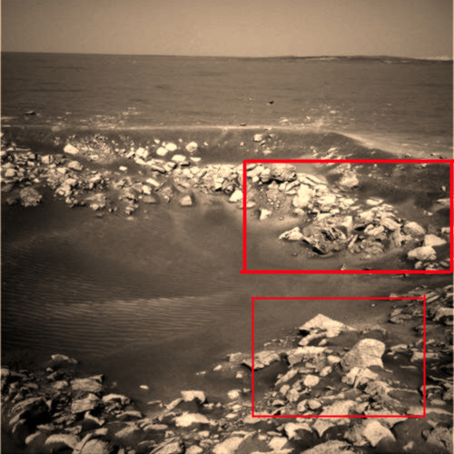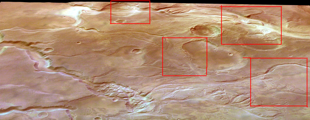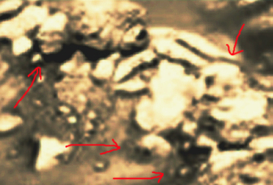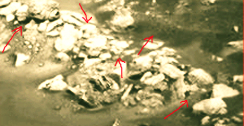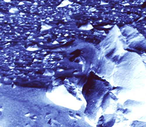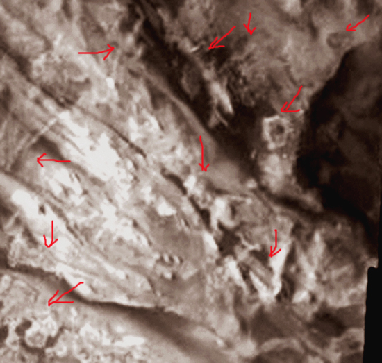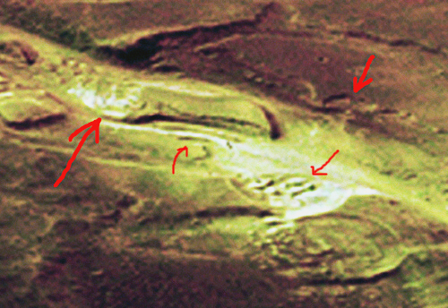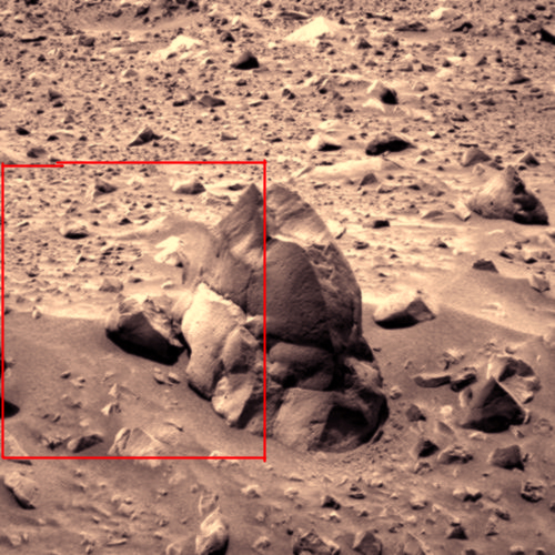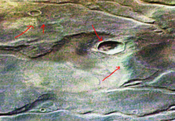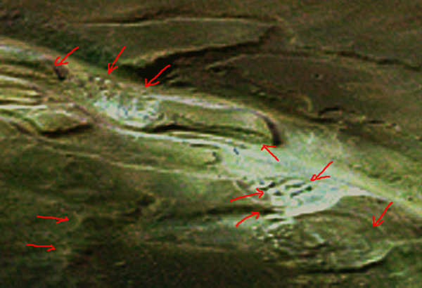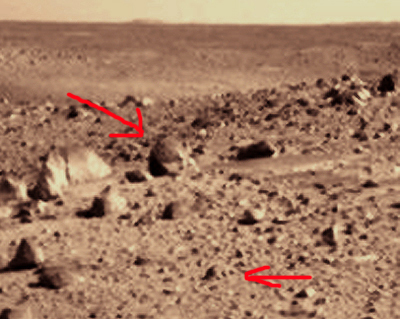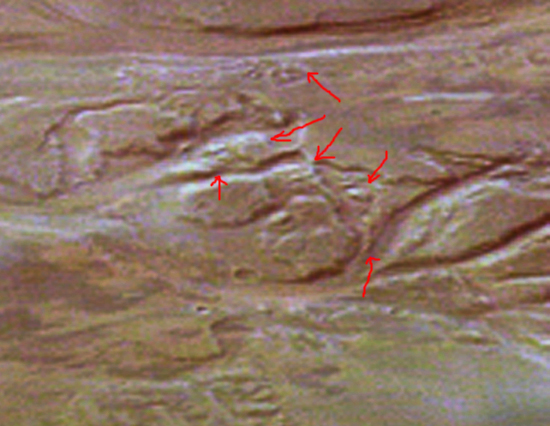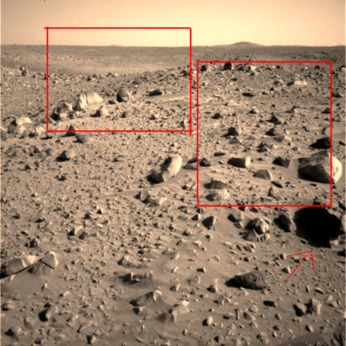 Mangala Vallesというところのパースペクティブの画像です。一見何も無い丘のようにも見えますが 拡大したりコントラストや明度やカラーの調整をしてみると意外なものが出てきました。