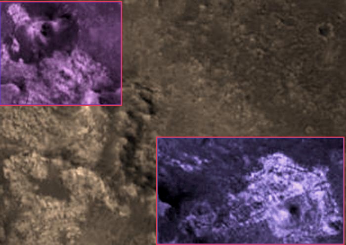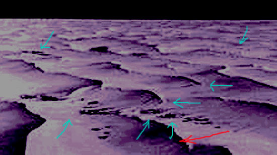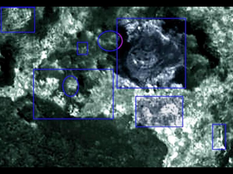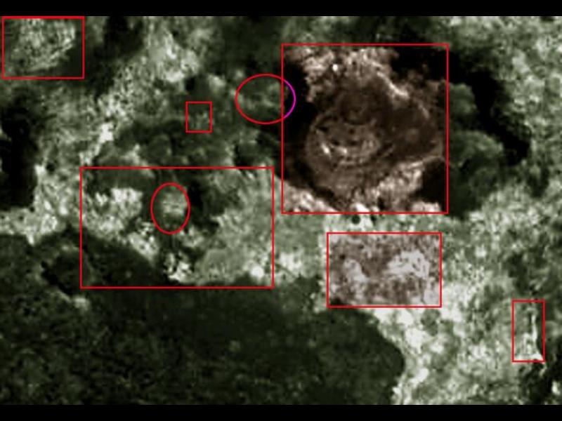 左は元画像の右上の部分です。何箇所か構築物らしきものがあります。氷の上に立体として立っている感じです。左にはロケット状のものがありその下にはやはり構築物らしきもの、中央付近にも大きな広場と塔のようなものが見えます。右の画像はさらに右側のものですが 元画像でもはっきりと判りますが大きな円盤型の物体が浮いているようです。下に影が映っています。その左にはやはり何か物体がありそうですし その右側には大きな球体が3つぐらい固まっていてさらにパイプ状のものがアールを描いている感じです。